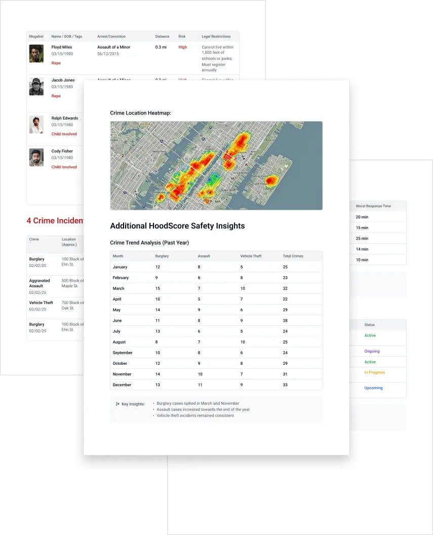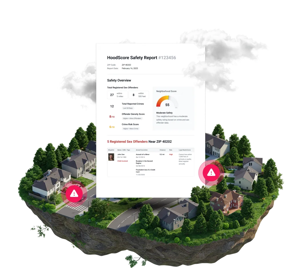 Guardely Real-Estate Safety Reports solve the gap with a concise, data-rich PDF covering crime counts, five-year trends, sex-offender proximity, and after-dark incident density—formatted for buyers, realtors, and underwriters alike. Each report focuses on a single ZIP code or city block, uses the same crime/offender engine that powers HoodScore, and is delivered in seconds.